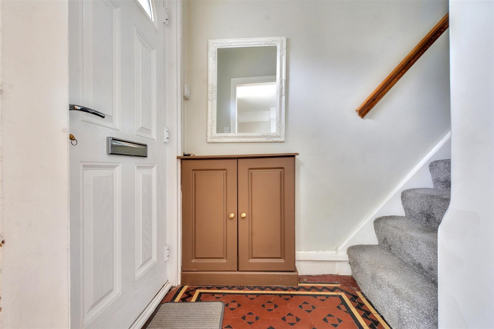 Original tiled flooring, meter cupboard, and stairs leading to the first floor.