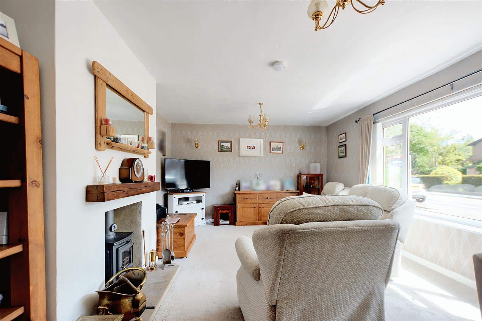 UPVC double glazed window, two radiators and a solid fuel burner mounted upon a flag style hearth with inset timber mantle.