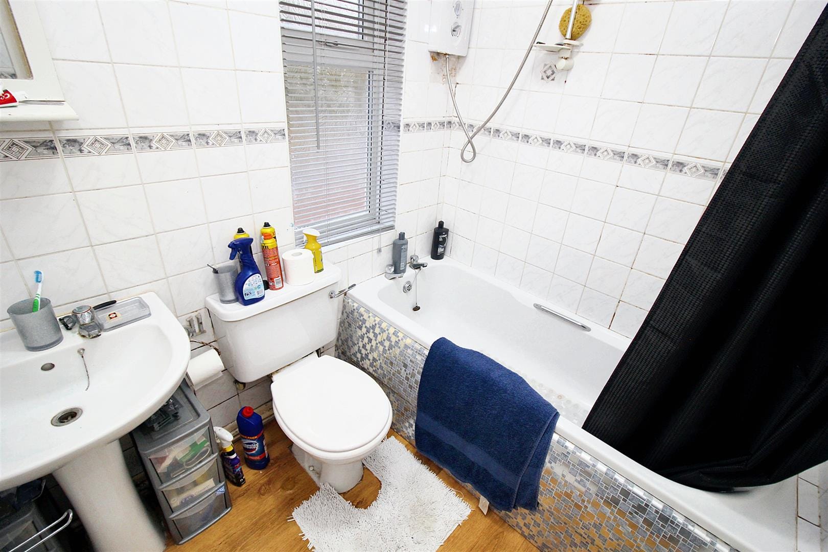 Fitted with a low level WC, pedestal wash hand basin, bath with 'Bristan' shower over, fully tiled walls, radiator and UPVC double glazed window.