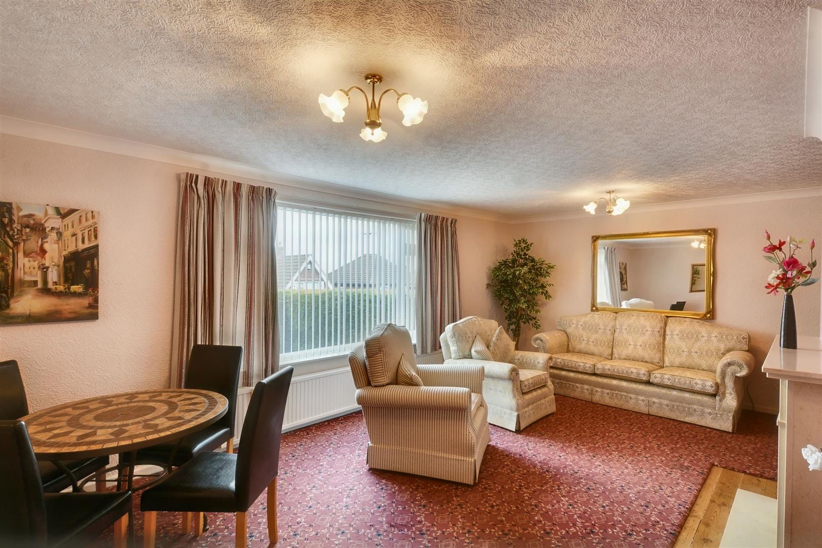 Double glazed window to the front with fitted blinds, radiator, media points, coving, ample space for dining table and chairs, central marble fireplace and matching hearth with inset coal gas fire.