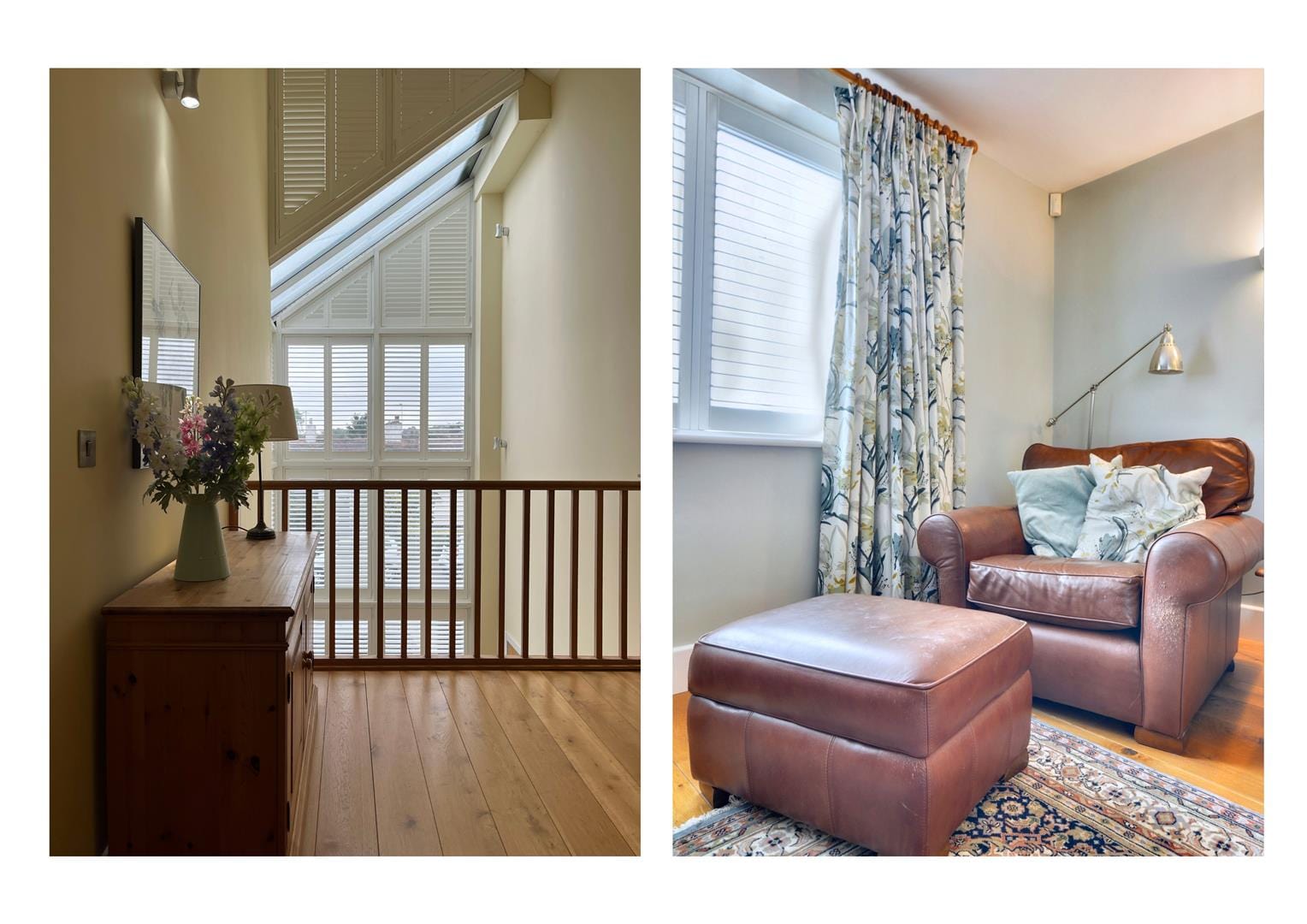 Triple glazed window with inset shutters, Fakro triple glazed roof light, and oak flooring.