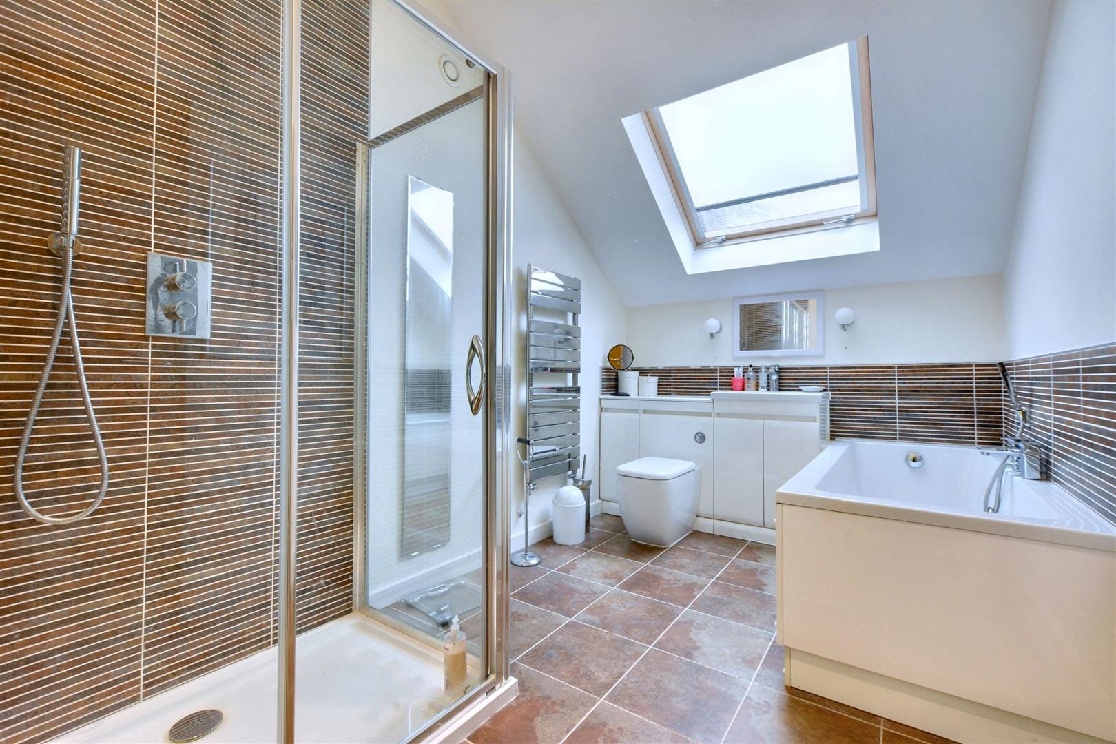 Incorporating wash hand basin and WC inset to vanity unit, bath with shower handset, double shower cubicle with over head shower and further shower handset, part tiled walls, tiled flooring, heated towel rail, and Fakro triple glazed roof light.