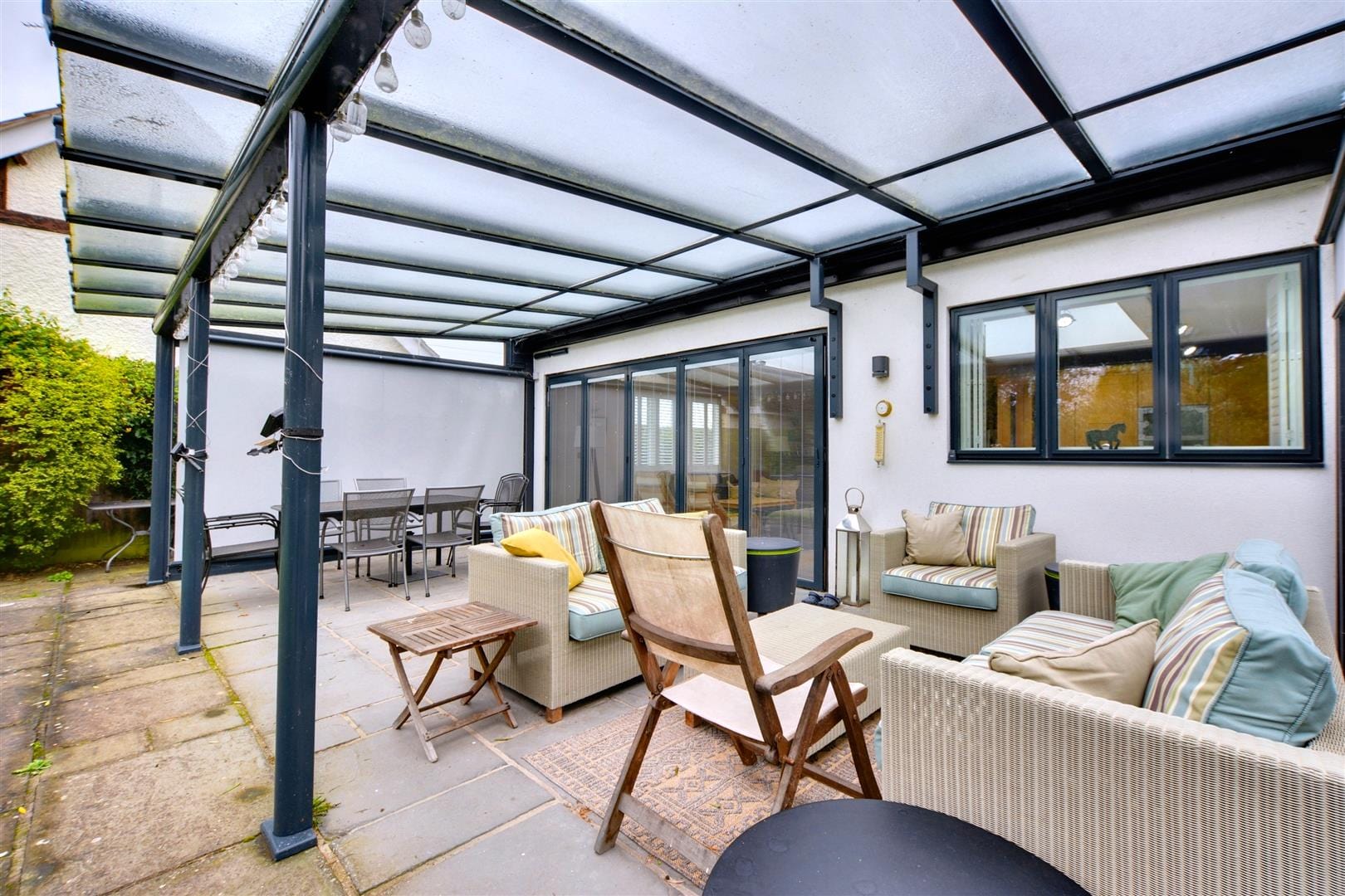 To the front, the property has a walled boundary with a pedestrian gate and further electric vehicle gates with a drive and garage beyond, and a landscaped garden with inset shrubs. Gated access leads along the side of the property to the large and mature rear garden. To the rear the property has a covered veranda with glazed sides and electric blinds. The rear garden is primarily lawned with various mature well stocked beds and borders with shrubs and trees, a further seating area with a pergola, three outside taps, three external electric sockets and a orchard with mature fruit trees, and a shed.
