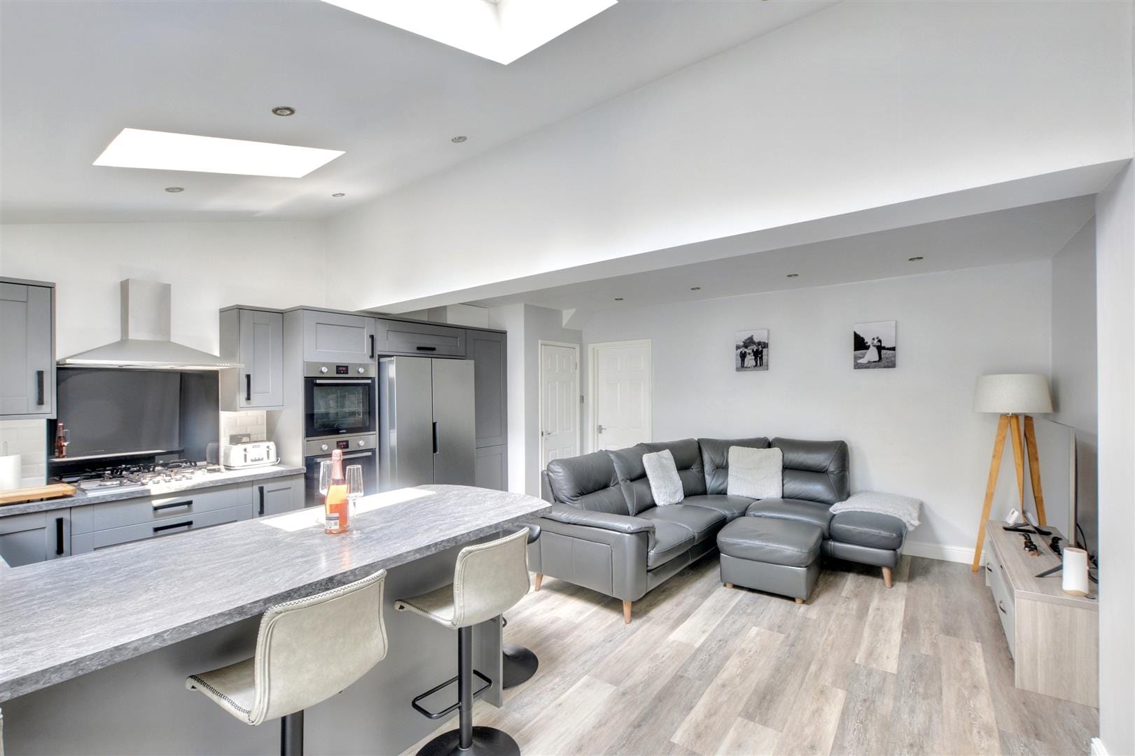 A range of wall and base units with worksurfaces over incorporating a sink and drainer unit with swan neck mixer tap over, five ring gas hob with extractor hood above, integrated double oven, space and point for an American style fridge freezer, space and point for a washing machine or dishwasher, tiled splashbacks, breakfast bar providing ample additional seating space, ample space for dining table, UPVC double glazed window to the rear elevation, UPVC French doors to the rear elevation leading to the rear garden, two Velux style windows, recessed spotlights to the ceiling, feature vertical radiator, TV point, understairs storage cupboard.