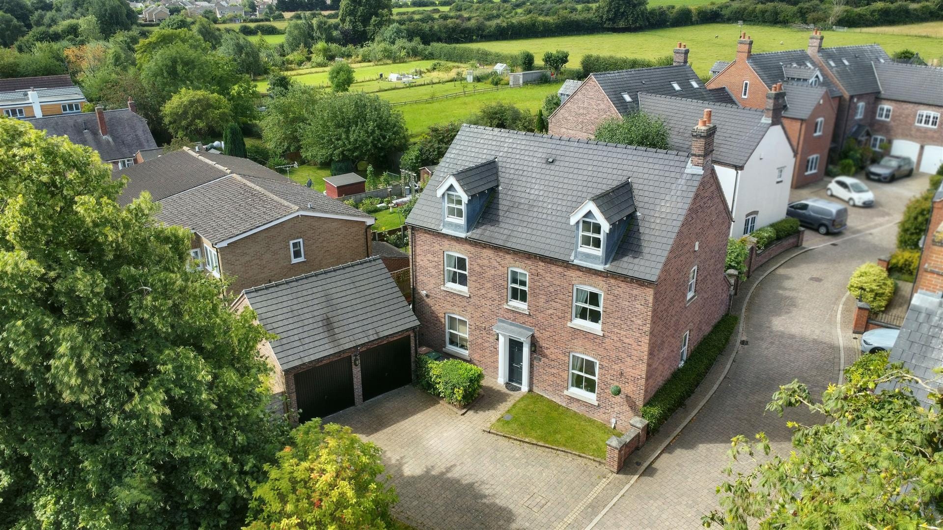 The property was built approximately 20 years ago and has an attractive facia brick to the external elevations under a pitched tiled roof and the well proportioned accommodation derives all the benefits of having gas central heating and double glazing. The house includes a spacious hall with tiled flooring and a ground floor w.c. off, a large lounge with French doors leading out to the rear garden, a separate dining room which has double wood panelled doors leading into the lounge, the breakfast kitchen is fitted with wood finished units and has granite work surfaces and off the kitchen there is a sitting area which again has French doors leading out to the garden and a separate utility room. To the first floor the landing leads to three double bedrooms, two of which have en-suite bath/shower rooms and there is the main family bathroom which has a bath and a separate shower. To the second floor there are two further double bedrooms and a shower room. Outside there is a brick built double garage positioned at the front of the house and this has a block paved drive at the front which provides off road parking for four vehicles and to the left of the drive there is a lawned area which could be altered to create further parking if this was required. At the rear of the property there is a private landscaped garden with a patio extending across the back of the house and this leads onto a lawn with established beds to the sides with the garden being kept private by having a brick wall and fencing to the boundaries and to the left hand side of the property there is a wood decked area which provides a beautiful private spot to sit and there is a gate behind the garage providing access to the private vegetable garden.