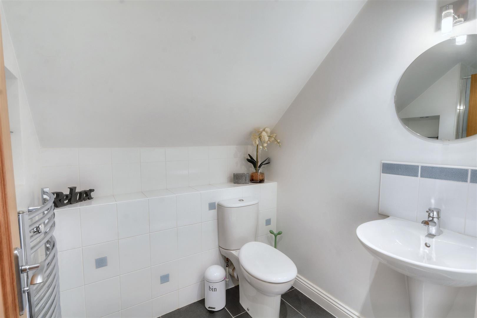 The en-suite to the second bedroom is fully tiled and has a walk-in shower with a mains flow shower system, tiling to three walls and a glazed pivot door, wall mounted hand basin with a mixer tap and a mirror with light to the wall above, low flush w.c., electric shaver point, chrome ladder towel radiator, opaque double glazed window, tiled flooring and recessed lighting to the ceiling.