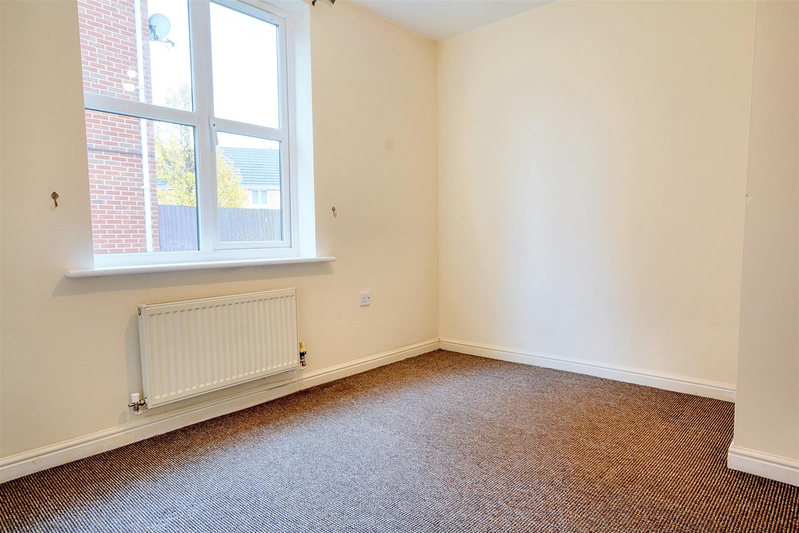 A carpeted bedroom with radiator, and UPVC double glazed window.