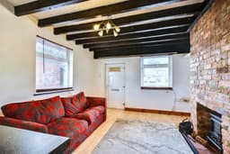 uPVC panel and double glazed front entrance door, double glazed windows to both the front and side (with fitted blinds), radiator, decorative exposed brickwork to the central chimney breast incorporating coal burning stove, media points, laminate flooring, exposed and painted beams to the ceiling. Opening through to the kitchen.
