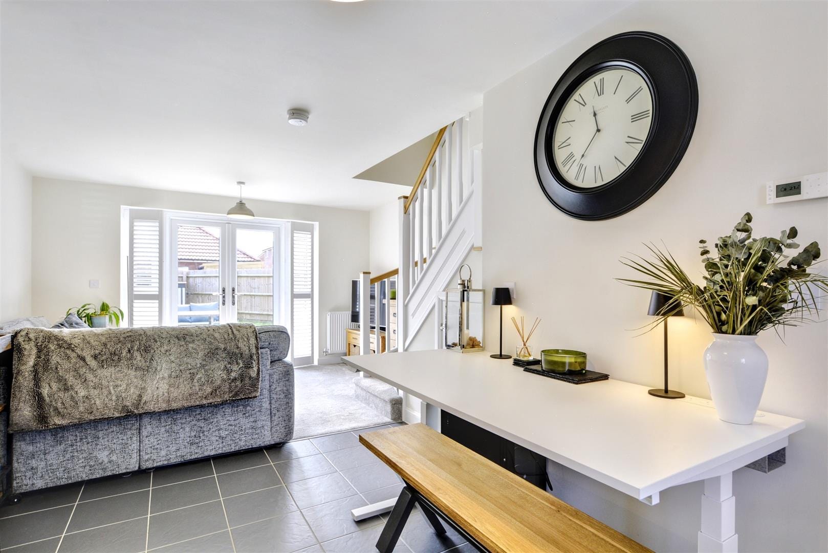 A carpeted reception area, with radiator and UPVC double glazed French doors to the rear garden with fitted shutters.