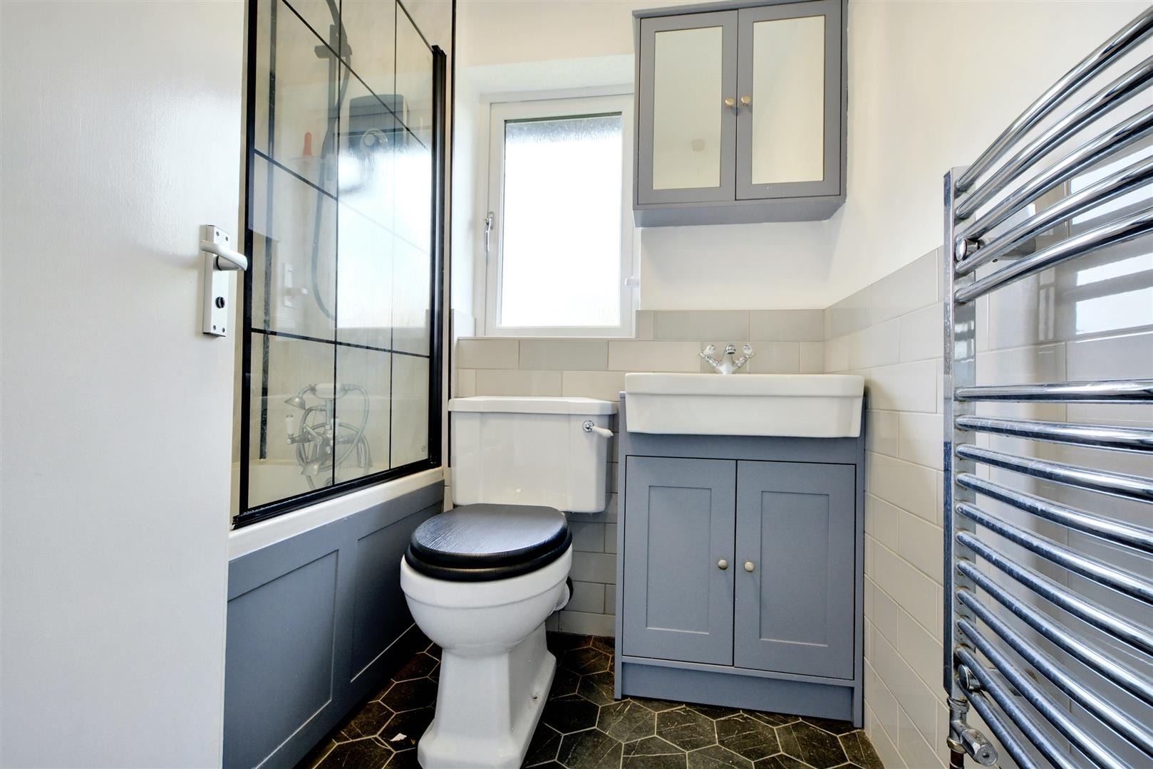 Incorporating a three piece suite comprising panelled bath with electric shower over, wash hand basin inset to vanity unit, low flush w.c., laminate flooring, tiled splashbacks, heated towel rail and UPVC double glazed window to the rear.