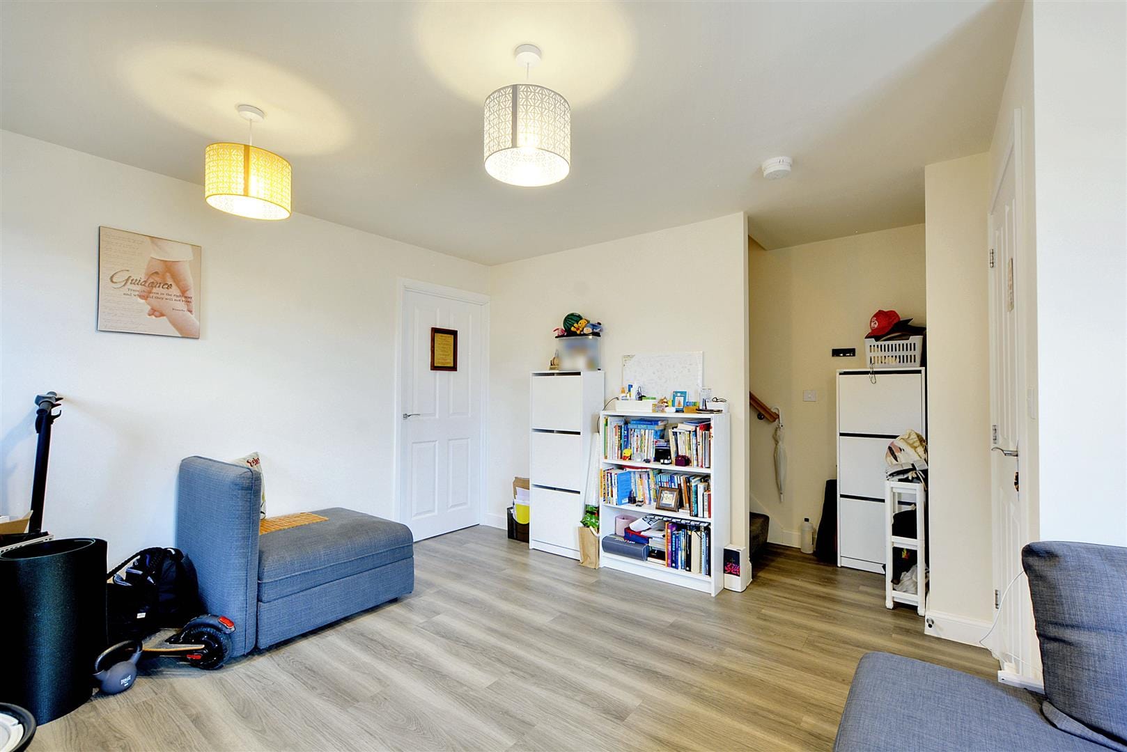 Composite entrance door through to the entrance hall with laminate flooring and door to the downstairs WC and lounge.
