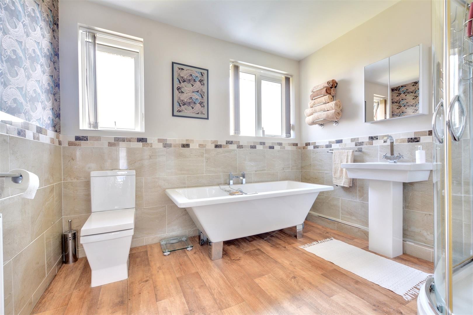 This spacious master family bathroom benefits from having a four piece suite comprising double ended freestanding panelled bath, large walk in quadrant shower enclosure with mains fed shower above, pedestal wash hand basin, low level flush WC, tiling to the walls, two UPVC double glazed windows to the rear elevation, ceiling light point, wall mounted radiator, vinyl flooring, built-in cupboard providing useful additional storage space.