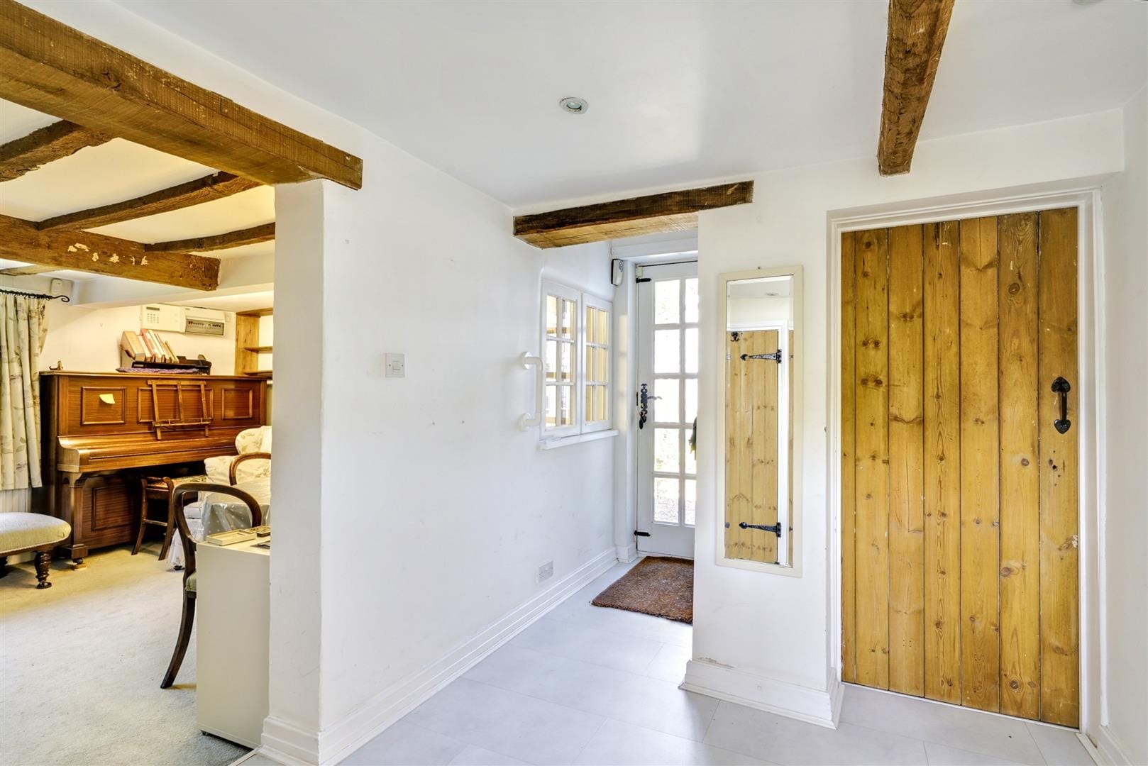A carpeted reception room, with exposed beam ceiling, radiator, feature stained glass window, UPVC double glazed bay window to the front aspect and French doors out to the courtyard garden.